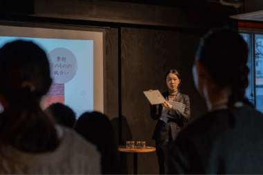 高級木材ウォールナットのような質感を持ち、成長の早いアカシア材を採用するなど、責任ある材料選択を実践されています。また、廃番になった磁器タイルのサンプルをコースターに再利用するなど、タイルを多く取り扱う企業ならではのユニークな工夫も紹介されました。