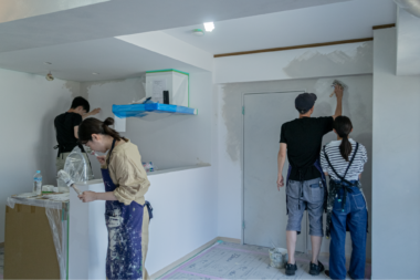 さらに、工事中に参加者を募って現場でペイントワークショップを開催しました。ポーターズペイントにご興味のある方や、近くにお住まいの方にお越しいただきました。オーナーさまにもご参加いただき、タッチアップのイメージを掴んでいただくことができました。地域との関わりと手作業の跡によって、この物件はより温度のある「思い出の残る空間」になりましたね。