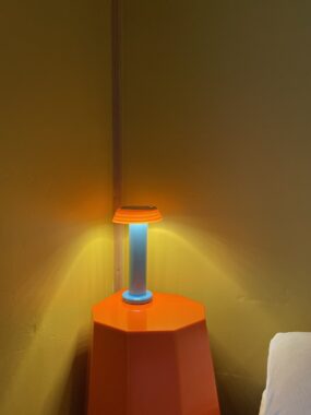 やっぱり自分の部屋ですね。黄色の壁にオレンジのスツール、その横に青いランプを置いていて、どの組み合わせも最高です。私は原色と原色の組み合わせが好きで、毎回ビビッとくるんです。壁との相性を想像しながらインテリアを探す時間も楽しくて、部屋の中は全部「最高」で埋まっています。