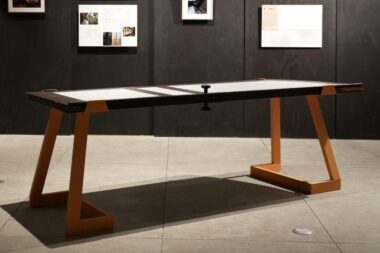 入口の最も広い空間「Lobby」には、2つの建築の実測調査に関するパネル展示と茨城県公館のドアを活用した机を展示いただきました。机は藤本研究室の学生さんと家具デザイナーの方が共同で制作されています。