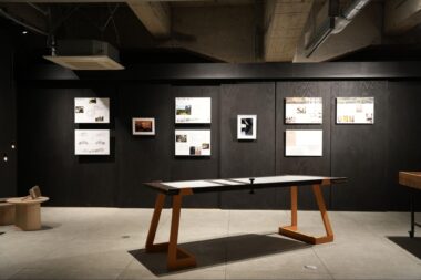 入口の最も広い空間「Lobby」には、2つの建築の実測調査に関するパネル展示と茨城県公館のドアを活用した机を展示いただきました。机は藤本研究室の学生さんと家具デザイナーの方が共同で制作されています。